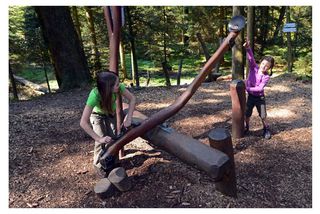Auf einer Fläche von acht Fußballfeldern geht die Entdeckungsreise weiter. Besondere Walderlebnisstationen die mit Pädagogen entwickelt wurden, fordern alle Sinne. Erst auf dem Wackellabyrinth durch vorgegebene Bahnen mit den Füßen und dem eigenen Gewicht die Kugel in ein Loch bugsieren, dann der klackernden Kugel an der Bahn durch den Wald hinterherrennen..