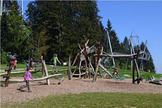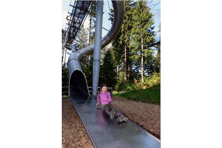Hier befinden sich Besucher auf Höhe der Baumkronen, wo sie sich sonst nicht befinden. Auf der schwingenden Hängebrückenkonstruktion braucht es dafür eine kleine Portion Mut. Am Ende lohnt es sich. Mit etwas Glück begegnen Naturfreunde dem Rot Milan auf Augenhöhe und können den mächtigen Vögeln beim Fliegen zuschauen. Rollstuhlfahrer und Kinderwägen gelangen durch einen gläsernen Aufzug auf alle Etagen des Baumwipfelpfades, bis zur 40 Meter hohen Aussichts-Plattform. Für alle Kletterbegeisterten wartet ein Alternativabstieg durch den Netztunnel. Beim Gang durch wackelige Platten und Hängebalken können Kinder testen wie geschickt und höhentauglich Sie sind. Über eine kurvige Röhrenrutsche geht es dann ein Stockwerk tiefer.
