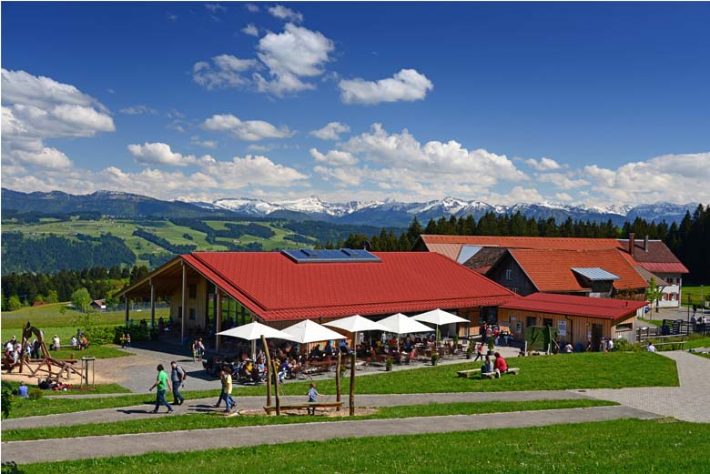 Nach so viel Bewegung wird es Zeit für eine Pause, um frische Energie zu tanken. Das Küchenteam lädt zu Allgäuer Kässpatzen und Maultaschen ein. Große Familientische bieten neben dem lichtdurchflutenden Glashaus auch im Biergarten mit Panoramablick auf die Allgäuer Nagelfluhkette Platz. Hier können sich die Kinder auf kleinen angelegten kleinen Spielplätzen in Sichtweite miteinander austoben.